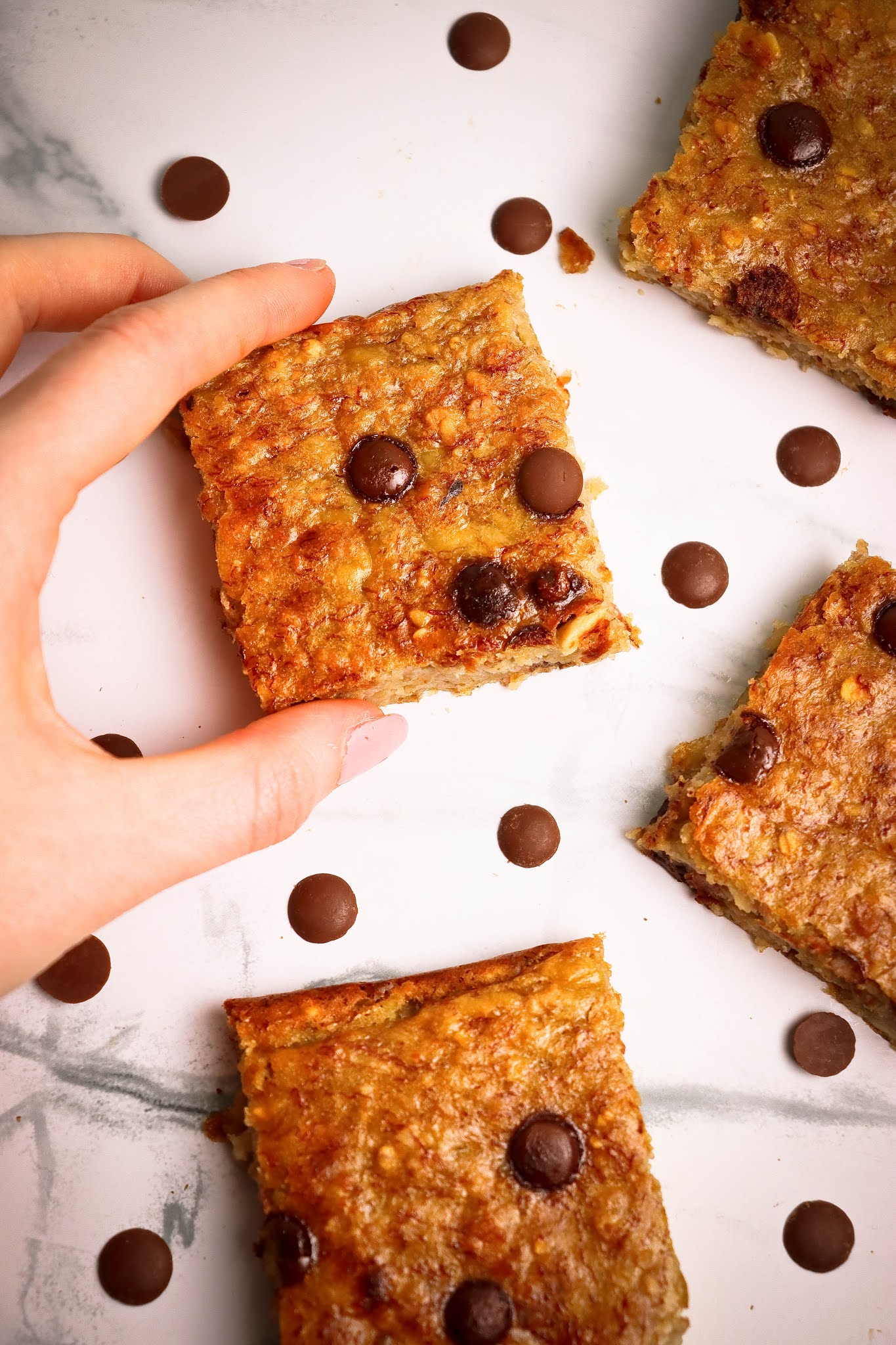 3. Изсипвате сместа в тавичка върху хартия за печене и декорирате с шоколадовите капки.